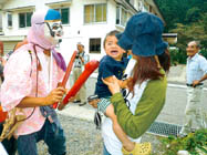 地域色豊か 秋祭り 小谷千国 繁栄願い「ささらすり」 小谷村千国の千国諏訪神社で15日、例祭が開かれ、子孫繁栄を願う奇祭「ささらすり」を見守る地元の氏子や県内外の多数の見物客らでにぎわった。 ささらすりは、地元の青年有志がひょっとこなどのお面で顔を隠し、木でできた大きな男根を竹のササラでこすりながら、若い女性や子どもを追い回す、同地区伝統の素朴でユーモラスな神事。ことしは口コミなどで希望者が例年より大幅に増え、20人余の若衆がにぎやかに地区内の各家庭や神社を練り歩いた。 |