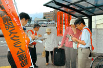 マイバッグ普及促進 大町で店頭キャンペーン 1日から「環境にやさしい買い物キャンペーン」が始まり、31日までの1か月間実施される。内閣府と47都道府県が共同して行うもので、スーパーマーケットなどの事業者は店舗へのポスター掲示や店内放送などでキャンペーンに協力する。県内ではスーパーや商店など約1250店舗が参加する。エコマークなどの環境ラベルを集めて応募すると、「木曽ヒノキ使用キッチンセット」が抽選で100人に当たる懸賞も実施する。 |