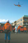 火災想定 連携を強化 大町 老人ホームで総合訓練 秋の全国火災予防運動期間中の12日、大町市の特別養護老人ホーム銀松苑で消防総合訓練が行われた。大町市や北アルプス広域大町消防署、消防団などから300人以上が参加し、連携強化とともに地域住民への啓発を図った。 実戦さながらの訓練は、施設地下から火災が発生したという想定で、施設職員が利用者を誘導して避難。消防署などが放水、救出訓練を実施した。県消防防災航空隊が、屋上から逃げ遅れた要救助者の救出訓練も行い、隊員が消防防災ヘリからロープで降下し救出を行った。 |