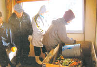 | 生ごみ共同堆肥化 小谷下里瀬 エコボックス設置 小谷村下里瀬の住民はこのほど、自分たちの家庭から出る生ゴミを共同で堆肥(たいひ)化する「エコボックス」を同地区公民館横に設置し、12月末から稼働を始めた。 エコボックスは信州大学の酒井信一名誉教授が提唱する大施設向きの生ごみ処理方法の一つ。廃材を使って木枠を組み、そば殻と生ごみを交互に投入して薬剤をふりかけて堆肥を作る。 同地区住民は、同村と村内の有志でつくる「生ごみ堆肥化推進クラブ」が同村下里瀬に設置した、生ごみを堆肥化するコンポスト実験施設で実験に参加するうちにその効果を実感。自分たちの手で同様の施設を新たに作り、地域のごみ減量と循環型社会の実践をめざそうと、有志の呼びかけに応えた。 |