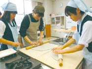 | 特産そばで食文化知る 美麻中生 手打ち体験 大町市美麻中学校は20日、そば打ち実習を行った。そばどころとして知られる地域のそば打ち職人に打ち方を習い、自分たちで一から育てたそばを味わい、地域の食文化に触れた=写真。 同校では毎年、全校生徒でソバの栽培を行い、種まきから刈り取り、調理・試食まで取り組んでいる。地区内にそばの名所とされる新行地域があることから、生徒にもなじみが深い地元のそば職人に打ち方を習い、地域住民との交流をはぐくんでいる。 |