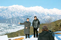 北アバックに「絆」紹介 テレビ東京 鷹狩山でロケ 3月に放映されるテレビ東京系の旅番組「田舎に泊まろう!」スペシャルの総合司会の撮影は28日、大町市の鷹狩山山頂などで行った。司会の徳光和夫さんが、絶景の北アルプスを背景に、日本に根付いた人々の絆(きずな)の力を紹介する。ロケは快晴の北アをバックに行われた。徳光さんは「日本一の雪景色。眼下の一軒一軒のお宅には、作家には思いつかないようなドラマがあります」と番組の導入のナレーションを語っていた。 |