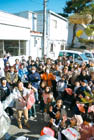 50年ぶり「福たわら」 池田あめ市 池田町で7、8の両日、恒例の「あめ市」が開かれている。7日は同町商工会商業部会による出店や福引、白装束の子どもたちによる各区の「市神様」の引き回しなどが行われ、多くの人が詰めかけにぎわった。同町のあめ市は明治初期から始まったといわれ、近年は人が集まる2月の第1週の土・日曜に行われる。町内一、二、四、五丁目、吾妻町、東町のそれぞれの拝殿で、市神様を祀(まつ)る。ことしは、菓子やだるまを投げる「福まき」のなかに縁起物や商品券を入れた「福たわら」を50年ぶりに原好住さんが作り復活させた。2丁目スペース・ゼロ前の福まき会場には200人ほどが集まり、大人も子どもも我先にと「福」に手を伸ばしていた。 |