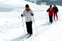 元五輪代表とクロカン 小谷でスキー教室 小谷村公民館は6日から、村民を対象にしたクロスカントリー教室を同村栂池高原の前山クロスカントリーコースで開講した。ことしはアルベールビル冬季五輪に出場した、村内在住の猪又由美さんが講師となり、幅広い世代の多数の村民が参加。猪又さんの熱のこもった本格的な指導のもと、歩くスキーでさわやかな汗を流している。 初日は開講式が行われ、参加者は猪又さんからスキーのはき方や歩き方の基礎を学んだ。初心者が多かったが、一流の指導者のレッスンですぐにコツを覚え、ストックを自分の体にあわせて滑りやすく調節して自在に動けるようになった。起伏のある前山のコースでの滑りにも挑戦し、1・5`のコースを滑ったり歩いたりして楽しんでいた。 |
