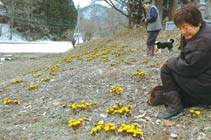 フクジュソウ見ごろ 大町市美麻新行の土手 大町市美麻新行の民家近くの土手で、春の到来を告げるフクジュソウの花が満開となり、アマチュアカメラマンらが訪れて写真に収める光景が見られる。周辺にはまだ雪が残っているが平年より少なめで、日当たりのよい南向きの斜面では今月初旬から順次花を開き、穏やかな陽気の13日は黄金色の花が一面に開き春の風に揺れていた=写真。 |