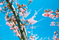 | 田淵館の百楽桜 安曇野市豊科、田淵行男記念館玄関前にある百楽(ひゃくらく)桜が例年より1週間ほど早く咲き始めた。安曇野は春らしい暖かな陽気が続き、みつを求めて花の周辺をハチが飛び、アマチュアカメラマンがピンクの花を見上げてカメラに収めていた。 百楽桜は、田淵がヒメギフチョウの研究場所のひとつとして訪れた白馬村沢渡の貞麟寺にあるエドヒガンザクラを母木にして出生したもので、平成3年に植えられた。強じんな生命力と田淵が残した言葉で一つの山には100の楽しみがあるという意味の「一山百楽」にちなんで名づけられた田淵にゆかりの深い桜。 |
