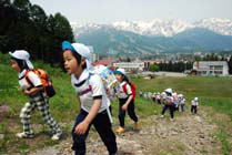 白馬の自然にふれ歩く 幼稚園児が遠足 白馬村の信学会白馬幼稚園(伊藤房光園長、園児96人)で26日、恒例の地域遠足が行われた。ふるさとの豊かな自然にふれ、歩くことで子どもたちの健康増進をはかろうと、毎年行われている。ことしは日ごろ園児たちが園外活動で利用し、村東部に位置するハイランドスキー場のゲレンデをクラスごとに散策した。 このうち年長園児35人は、標高700bのゲレンデ下部から、標高800bの山頂まで、約1・3`を登った。園児は冬に同スキー場で雪遊びなどを体験しているが、初夏の里山は緑が濃く活力にあふれ、冬とまったく異なる趣に感動していた。 |