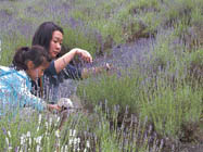 池田花盛り*イ農場 ラベンダー見ごろ 池田町陸郷の夢農場(水野龍二農場主)で13日から、第17回夢農場ラベンダー祭りが始まった。農場一面に、見ごろ間近かとなった薄紫の花を付けたラベンダーが訪れた人たちを彩りや香りで出迎えている。14日午後は、人気イベントの野豚丸焼き無料試食会がある。 7万株のラベンダーが咲き始めた約4fの農場内では、家族連れで摘み取りを楽しむ姿がある。 会場で販売されている水野農場主考案の「鬼翔うどん」も話題を集める。「信濃大地」というブランド小麦粉や国産キノコ、山菜など食材にこだわった一品で、特製やくみを添えた。「鬼も空を翔るほどのうまさ。元気が出てくる味」と自信をのぞかせる。 |