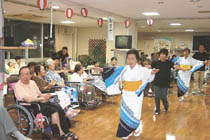 | 踊りで夏の夜楽しむ 池田 特養高瀬荘で納涼祭 大北各地の高齢者福祉施設などで、納涼祭が相次いで開かれている。池田町の特別養護老人ホーム・高瀬荘(大北社会福祉事業協会、太田和子所長)でも7日、納涼祭を開いた。同日はあいにくの天気で会場を屋内に移したが、入所者やショートステイ利用者は、盆踊りなどで夏の夜を楽しんだ。 地元の信州天野会による練りこみ太鼓の笛や囃子で、祭りの幕があけた。盆踊りは八千草会のメンバーが主導し、炭坑節や池田あっぱれ、やまびこサンバなどの音楽に合わせて踊り、館内を練り歩いた。踊りには車椅子の利用者や家族、職員らも加わり、みんなで夏の踊りを楽しんだ。会場にはまんじゅうや豚汁、アイスクリームなどの夜店コーナーが並び、祭り気分を盛り上げた。 |