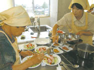 | 夏野菜料理で健康に 松川村食改が講座 県食生活改善推進協議会大北支部松川地区(矢口勝代代表・会員56人)は20日、「食改はつらつヘルスメイト講座」を松川村多目的交流センターすずの音ホール調理室で開き、「夏野菜たっぷりメニュー」の調理実習を行った。メタボリック症候群や高血圧症など、成人病の予防を意識し、栄養士らが考えた献立を調理、試食する事で自分や家族の健康管理を食事から考える講習会。手に入りやすい材料で誰でも簡単できる調理を年間6回実施する。参加した会員20人は、そろいのエプロンと三角きんで身支度を整え、5グループに分かれ慣れた手つきで調理に取りかかった。各自が持ち寄った家庭菜園や畑で収穫したキュウリやトマトなどの夏野菜をふんだんに使い、調味料に酢を用いてさっぱりとしたメニュー4品を次々と仕上げた。 |