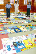 力作ポスターを審査 安曇野署と防犯協 安曇野署(関原敬泰署長)と安曇野防犯協会連合会は3日、防犯ポスターコンクールの地区入賞者審査会を同署で開いた。子どもならではの自由な発想で、防犯思想を訴えた作品が並んだ。同ポスター募集は、子どもたちへの防犯思想の普及や啓発を図ろうと毎年開催している。管内16小中学校の小4年生から中学3年生まで、四つ切りの画用紙に標語と絵を描いた力作421点が寄せられた。審査は豊科高校の山崎亨・美術教諭をはじめ、関原署長や副署長、生活安全課長の4人で実施。集まった作品から各学年ごとに計30人を選出。さらに、計8人の金賞受賞者は、県防犯協連合会のコンクールに送られる。時勢を反映し、昨年は1件だった振り込め詐欺への注意喚起を呼びかけるポスターが目立った。車上狙いのテーマも目立ち、ドアロックより頻発するガラス割りの手口に注意を訴える内容が増えていた。身近な問題として防犯ブザーの使用や万引・薬物に手を出さないように呼びかけるものも多かった。 |