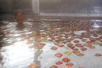 | 温泉で甘い香り満喫 大町 ゆーぷるで「リンゴ風呂」 大町市平の「ゆ〜ぷる木崎湖」は27日、施設内浴場でリンゴ風呂を実施した。利用者に地域の季節を味わってもらおうと、傷などで販売できない大町産リンゴ約400個を、湯船に浮かべた=写真。 利用者は、湯船にゆったりとつかりながら、秋の地元特産品から漂う甘い香りを満喫。湯面を漂うリンゴを手に取り、笑顔で顔に近づけていた。 同施設では月に1度、「風呂の日」を設け、薬草やハーブ、ササなどを使った温泉サービスを提供。12月は冬至に合わせ、22日と26日にユズ湯を実施する。 利用者が「より一層、温まるような気がする」「良い香りで、楽しい気持ちになる」などと感想を話し、好評だ。 |