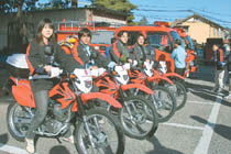 | 池田 安心安全に強い味方 消防団に新型ポンプ車とバイク 池田町消防団(山本誠治団長)に8日、最新型の高性能消防ポンプ車2台とオフロード用バイク4台が納車された。消火や救護での活躍が期待され、町民の防災の力となる新たな車両が仲間入りした。新型消防車は排気量4gのディーゼルエンジンで、3連の高性能タービンポンプを備え、迅速で強力な放水が可能となる。150h(家庭用照明1000h相当)の作業用ライトや可搬式のレスキューライトなどを備え、夜間の出動に対応する。啓発用の広報用音声なども録音されている。20年以上使用した旧消防車の老朽化に伴う更新で、1台1890万円。本部分団と、二丁目から五丁目の団員で構成する第1分団2部に配備される。オフロード用バイクは排気量230tで、赤い塗装にナックルガード、トランクなどの装備を持つ。救護隊に配備され、悪路走破性を生かし、自動車では入れない場所での救護や情報収集にあたる。これまでの2台に加え、6台態勢を整えた。 |