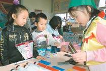 | 大町 りんどう幼稚園 お店屋さんごっこに笑顔 大町市平のりんどう幼稚園(西澤弥恵子園長・60人)で10日、毎年恒例のお店屋さんごっこが開かれた。園児たちは模擬貨幣を使って部屋中に並んだ手づくりのおもちゃやネックレス、帽子などを買い求めた=写真。 開園当初から、園児に社会性を芽生えさせようと開かれている。年長園児は売り手側も体験し、園児同士が売り買いすることでコミュニケーションを図る。 |