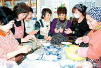 おやき作り学ぶ 大町のJA社女性部 JA大北の社女性部(遠藤道代部会長)は14日、大町市社公民館でおやきづくりをした。会員ら約15人が、手軽に作ることができるフライパンで焼くおやきに挑戦した。会員の降旗宮子さんが指導。降旗さんが昨年友人から教わったという、焼くタイプのおやきを教えた。耳たぶくらいのかたさに丸めた生地に、「底の部分があまり厚くならないように」などと指導を受けながらタネとなる、あんこやおから、野沢菜などを手際よく包んでいった。おやきをフライパンで焼くと、香ばしい香りがあたりに立ち込めていた。 |