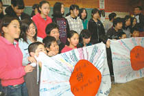 白馬勢に届けエール 南小で五輪応援旗作り バンクバー冬季五輪大会に出場する白馬出身6選手にあてた応援旗の制作が21日から、白馬南小学校を皮切りに始まった。子どもたちは、五輪での活躍を願いながら「金メダル目指して頑張って」などメッセージを国旗に書き込んでいった。 南小では、同小学校出身の男子距離・成瀬野生選手と、女子距離・柏原理子(みちこ)選手に向けて応援メッセージ。 子どもたちはマジックを手に、縦90a、横130aの国旗2枚を取り囲んだ。木我直由校長が書いた「絆 Do your best」の言葉を中心に、「思い切り楽しんできてください。白馬より応援しています」など思いおもいの言葉で選手にエールを送った。 応援旗制作は、白馬北小や白馬中、白馬高校でも今後行われ、来月には、現地カナダに応援に行く選手家族に贈呈する予定だ。 |