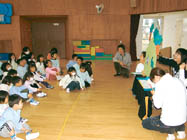 | 園児人形劇に笑顔 池田のグループ訪問 池田町を中心に活動している読み聞かせグループ、「会染母(ぼ)んばー」は、町内3保育園の園児に、読み聞かせや人形劇などで楽しい時間を提供している。21日は、南保育園(矢口澄子園長・園児53人)を訪れ、手作りのぬいぐるみや段ボールの仕掛けを使ったお話など4話を遊戯室で披露した。小さな子にもなじみの昔話、「ももたろう」では、冷蔵庫用の大きな段ボールで制作した「回転式変身絵本」で話をすすめた。物語の代表的なシーンが6面にそれぞれ描かれ、主人公の桃太郎や登場する動物たちの輪郭を切り抜き、そこからメンバーが表情豊かに顔を出す仕掛け。園児たちは、話とともに動く人形や次々と展開する仕掛けに夢中になり、会場に笑顔があふれていた。 |