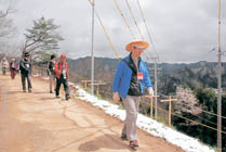| 雪と桜の共演楽しむ 池田陸郷山桜トレッキング 桜の開花シーズンを迎え、池田町陸郷地区の山桜トレッキング(北アルプス展望ウォーク実行委員会主催)が17、18の2日間、同地区で開かれた。18日は、約40年ぶりともいわれる雪と桜の共演や、青空に映える北アルプスなど風情ある景色を眺めながら、県内外から訪れた約40人がトレッキングを楽しんだ。前日から降り積もった突然の積雪の影響で、本来のトレッキングコースを変更し、夢の郷コミュニティーセンターから二本松、登波離橋などを通る約6`を歩いた。ガイドマスターに各所の説明を受けながら、晴れ間に望む北アルプスや、山々に咲き誇る桜など自然景観を満喫した。昼食には、夢農場で季節の山菜や豚汁が振舞われ、舌鼓を打っていた。 |