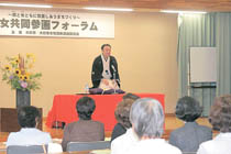 | 落語通じ男女尊重学ぶ 大町市で共同参画フォーラム 大町市、市女性団体連絡協議会、市教育委員会は12日、第16回男女共同参画フォーラムを大町公民館講堂で開いた。市内から約100人が訪れ、関西を中心に活動する落語家の林家花丸さんを講師に、笑いを通し、男性と女性がともに尊重しいきいき暮らす社会について考えた。講演で林家さんは「男女共同参画 前向きにまるく考える」を演題に高座に登場。小話の紹介を絡めつつ、結婚や出産、家庭をテーマにした落語を披露。細かいしぐさや声色を使い分けながら語り、来場者は男女の役割を考えさせる物語に引き込まれ、会場には笑いと拍手が響いた。 |