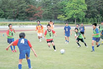 | プロからサッカー技術 パルセイロが子ども指導 大町市運動公園陸上競技場で13日、サッカーチームAC長野パルセイロ選手によるサッカー教室が行われた。近隣ジュニアサッカーチームの子どもたち約150人が参加し、プロからサッカーの技術を学んだ。選手ら20人は同公園で行われた北信越リーグ後に子どもたちに指導。小学1、2年生を対象にした教室は、リフティング練習からスタートし、選手らが考えたメニューに取り組んだ。自分のボールを守りながら相手のボールを弾き飛ばすゲームなどを通して、ふれあいながらサッカーの楽しさに触れた。 |
