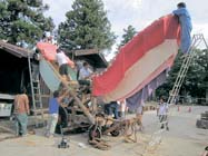 伝統の舞台引き回し 八幡神社23日から例祭 池田町の八幡神社で23、24の両日、秋の例大祭が行われる。伝統の舞台引き回しや船曳(ひ)き、奉納相撲などが行われ、町民の無病息災や五穀豊穣を願う。初日は午前11時から、8地区の住民がそれぞれの山車ととも町内を練り歩く、舞台引き回しが行われる。加藤清正や弁財天、大黒天などの人形を乗せた山車が、お囃子(はやし)の音色とともに神社を目指す。 中央通りが午後6時から、歩行者天国となり、舞台のちょうちんに火がともり幻想的な光景を描き出す。2日目は午前7時半から、高さ3bを超える2艘(そう)の「お舟」が、神社を発着点に、町内をめぐる。午後2時から境内で、奉納相撲が行われる。例大祭は例年、町内外から訪れた観光客や住民ら数千人でぎわい、池田の秋を彩る。 |