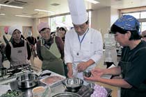 地元産材料理のコツ 県調理師会大北が食大学 県調理師会大北支部(北澤英明支部長)は29日、地域の食文化継承を図る「しなの食大学」の第7回を、池田町総合福祉センターで開いた。大北地域から参加した受講生約30人が、ブランド認定品や池田町特産のハーブなど、地元食材をふんだんに使った料理を学んだ。参加者は、和洋2人の調理師を指導員に、町農産物加工組合「カモミールの会」のテンペみそを使った洋食など調理に取り組んだ。意外な組み合わせに驚きを見せながらも調理のコツに耳を傾け、完成した料理に舌鼓を打っていた。 |