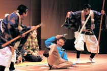| 来場者交え笑いの舞台 歌舞劇団「田楽座」松川で 伊那市を拠点に活動する歌舞劇団「田楽座」が3日、8年ぶりの松川村公演を村すずの音ホールで行った。昼と夜の2回公演で、村民を中心に約400人が来場し、笑いを交えた民俗芸能の舞台を楽しんだ。 公演は滋賀の水口囃子(ばやし)や鳥取の盆踊り、津軽民謡など多彩な演目を披露。笑い講で山伏2人が来場者を交えながら、こっけいな掛け合いを繰り広げ、会場は大きな笑い声に包まれた。 |