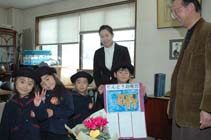 | 「お仕事ごくろうさま」 りんどう幼稚園 カレンダー大糸タイムスに 大町市平のりんどう幼稚園(西沢弥恵子園長)は16日、年長児18人が市内の公共施設や事業所など訪問し、手作りのカレンダーをプレゼントした。23日の「勤労感謝の日」にちなんで毎年実施している恒例行事。 大糸タイムス本社にも、4人の園児が訪れて「いつもお仕事ごくろうさまです。カレンダーを作りました。飾ってください」と声をそろえ、折り紙の動物など張って作成した平成23年版カレンダーとシクラメンの鉢植えを、水久保節社長に手渡した。 |