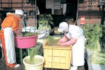| 初冬の大北お菜洗い 漬け込み作業本格化 つけものや 大町市の女性農業者らでつくる「信濃大町のつけものや」(曽根原叶子代表・8人)で、野沢菜の漬け込み作業が本格化している。25日は、同市平大町温泉郷の加工所で約120㌔を漬け込むため、会員3人が温かい日が差す穏やかな陽気の中で「お菜洗い」を行った。 会員の畑で栽培し持ち寄った野沢菜は「ことしは暑かった影響でやや丈が短い」としながらも、大きなおけに水をたたえ丁寧に洗っていた。 漬け方については「いろいろなものを入れるのは邪道。野沢菜漬けのもとと塩だけで他は何も使わない、本来のシンプルな漬け方。材料から製品まですべて手づくりです」と話した。 大北地域の初冬の風物詩といわれるお菜洗いは、同会では今月中旬から始まって12月初旬まで行われ、消費者からの委託分と同会の販売分を合わせ約550㌔を漬けるという。 |