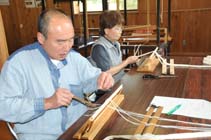 | 伝統ぼろ織り習得 おたり名産館で養成塾 小谷村と村の有志でつくる「小谷ぼろ織りの会」主催による、「織り姫養成塾」が6日、同村おたり名産館でスタートした。村の伝統工芸の魅力に魅せられた受講生4人が、月末までの集中講座で技術の習得に励んでいる。 ぼろ織りは貴重な布を最後まで慈しみ、大切に使い切るという庶民の知恵から生まれた織物。伝統技術と美しさが優れた工芸品、リサイクル文化として注目を集めている。同塾修了生は村認定の織り姫として、習い覚えた技を生かし、自作品を名産館などで販売し、好評を得ている。 |