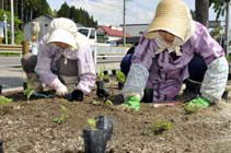 | 6種の花大きな鉢に 商議所女性会寄せ植え講習 大町市 大町商工会議所女性会は14日、寄せ植え講習会を開いた。同市名店街の生花店、ナガサワ・フローリストの店主長沢哲士さんを講師に、6種の花を大きな鉢に植えかえた。 会員10人はハイビスカスとカリブラコアの花をメーンに、夏から秋にかけて楽しめる花4種を自由に選んだ。基本パターンを基に色合いやバランスを考え、「子どもにもどったみたいで楽しい」と夢中で植えていた。 |