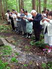 | 天からの恵み次代に 居谷里で水道水源感謝祭 大町市 大町市は1日、水道水源感謝祭を居谷里水源内の八坂神社奥宮で開いた。生活や農業、防火用水などで暮らしを支える市の水道水を供給する水源に感謝し、水環境を大切に使うことを誓った。 市や市議会、市消防団、水利関係者、水道事業協同組合、連合自治会などから約80人が参列。清水が湧く森に囲まれた神殿で神事を行い、玉串をささげ献杯した。 |