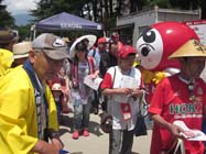 | 大町で人権啓発活動 グランセローズと提携 長野地方法務局大町支局(今井優支局長)と大町人権擁護委員協議会(瀧澤勇三会長)は23日、県民球団「信濃グランセローズ」と連携した人権啓発活動を、大町市運動公園野球場で行った。同日は、グランセローズ試合の日。会場入りする子どを中心とした観客に、人権サポーターカードを配り、青少年の健全育成を願った。 人権サポーターカードは、表紙に選手写真、裏面に子どもの人権110番や24時間いじめ相談のダイヤル番号などが入り、悩みや心配ごとの相談を呼びかけている。 |