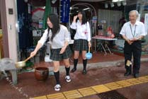 打ち水で涼しく 客や通行人に呼びかけ 大町の塩入 大町市九日町の塩入洋服店(塩入博仁店主)は県の節電事業「さわやか信州省エネ大作戦」に合わせて、体感温度を下げようと、客や通行人に打ち水を呼びかけ、あたりを涼しくしている。 東日本大震災の影響で節電が求められている今夏、同店は少しでも涼しさをと打ち水を実施。打ち水は気化熱を利用し、水が蒸発する際に熱を奪うことで涼しさが味わえる。 |