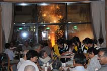 手作り屋台や花火 白馬 白嶺納涼祭楽しむ 白馬村の特別養護老人ホーム白嶺(川上明子所長)は29日、恒例の「白嶺納涼祭」を開いた。悪天候で、急きょ会場を室内に変更しての実施となったが、利用者や家族は職員の手作り屋台や花火などのアトラクションで楽しいひとときを過ごした。 七夕飾りや紅白幕などで飾り付けられたホールは、屋外にも負けない祭りムード一色に変わり、利用者を喜ばせた。入所者のお年寄りはボランティアから浴衣の着付けと薄化粧をしてもらい、華やかないでたちで祭りに参加。地元の有志でつくる踊りグループや屋台などのアトラクションを存分に堪能した。 祭りという非日常空間が、来場者の距離を縮めて一体感をつくり上げ、お年寄りたちは表情も明るく真夏の夕涼みを満喫していた。 |