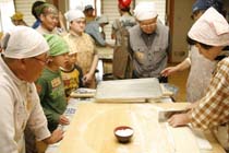 手打ちうどんで交流 大北の手をつなぐ育成会 松川のすずむし荘で 大北地域の知的障害者や家族でつくる、大北圏域手をつなぐ育成会は2日、障害者ふれいあ事業・うどん打ち交流会を松川村のすずむし荘で開いた。 身体・精神・知的などさまざまな障害のある人やその家族ら47人が参加。粉から手作りでうどんを打つ体験を楽しんだ。参加者は粉を丸く練り、棒でのばし、包丁で切るなどの作業を協力して行った。昼食には、打ちあがったうどんを囲んで楽しく交流。懇談会で情報を交換した。 |