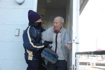 | 強盗想定し防犯訓練 大町署と大北遊技場協 市内店舗で 大北遊技場防犯協会(斎藤彰宏会長)と大町署は14日、パチンコ景品交換所での強盗を想定した防犯訓練をジノス大町店で開いた。大北地域の遊技場関係者が参加し、防犯対策強化に向け認識を深めた。 大町署員扮(ふん)した強盗が景品交換所に現金を運び込もうとする従業員を襲うという想定で訓練は行われた。 「金を出せ」と拳銃のようなものを突きつけられた従業員は、緊急事態を周囲に知らせようと「強盗だっ」と叫び声をあげた。金を持ち去られた後、景品交換所内にある非常ベルを押し、カラーボールを手にした。 大町署は訓練を振り返るなか、素早い通報や、人相や着衣といった犯人の特徴を記憶することなど呼びかけた。 |