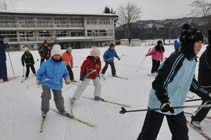 | 雪活用し校庭クロス=@白馬、小谷の小学校 実技指導 白馬と小谷両村では、毎冬小学校の校庭がクロスカントリーのコースに変身。雪を活用した体育の授業の一環として、クロスカントリースキーの実技指導が行われている。児童は寒さに負けず、体力づくりに励んでいる。白馬南小学校では23日、白馬五竜スキースクールの松本茂コーチの指導によるクロスカントリースキー教室が開かれ、技能向上をめざした。 学年別、個々のレベル別に細かくアドバイス。ストックをつかずに体のバランスを取りながら板を滑らすことから始め、徐々にステップアップしていった。授業の後半にはしっかり基礎が身に付き、楽しそうに走りこむ姿が見られた。 |