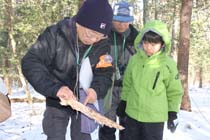 「安全ゾーン」で自然観察 国営公園大町松川で雪まつり 国営アルプスあづみの公園大町・松川地区は11、12の両日、雪まつりを開いた。普段は自然保護のため、来場者の入場が制限されている「保全ゾーン」での自然観察会など、地域の魅力を満喫するイベントで来園者を迎えた。 観察会は「いきものの森探検隊」と題し、家族連れなど来園者が、地域の自然に精通した公園サポーターの案内で、雪に覆われた森の中を散策した。土中に穴をあけたアカネズミの巣や、昆虫のハイイロチョッキリが切り落とした木の枝など、園内で見つかる生き物の痕跡に、子どもたちが興味深く見入っていた。 |
