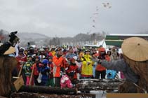 昼の部は昨年に続き「一本ぞり滑走」のデモンストレーションが行われた。一本ぞりは、昭和30年代ごろまで同村の主要な産業であった林業で真冬の木材の搬出手段として多大な役割を担っていた冬の用具。次世代に伝統技術を伝えようと、保存会が設立されてイベントなどで披露している。 ことしは鐘の鳴る丘ゲレンデから、9台のそりが滑走を披露した。みのとすっぺんじょと呼ばれる雪靴、かんじきという当時のいでたちに身を包んだ会員が、木材を積んだそりをジグザグ操作しながら実演した。 そりに積まれたのは4bの長さの丸太数本で、総重量は1台100`を超える。重さをものともせず、みごとな運搬技術を披露し、会場を沸かせた。 |