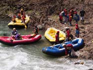 | 川下りと環境美化 姫川をラフティングボートで 白馬 白馬村の白馬アドベンチャークラブはこのほど、地元の親子に呼びかけて、姫川をラフティングボートで川下りしながら、川の清掃活動を行うボランティアを実施した。日ごろアウトドアスポーツで楽しみを与えてくれる川と自然に、清掃活動をすることで恩返しをし、環境美化・保護意識を高めようと、無料で企画した。八方尾根観光開発も活動に賛同し、ラフティング後の子どもたちの入浴料の無料サービスに協力した。 数日の呼びかけにもかかわらず、村内から多数の親子が集まった。大出のつり橋など観光名所を流れる清流で、クリーン作戦に取り組んだ。 ライフジャケットに身を包み、安全講習を受けていざ出発。ボートを操作しながら、中州などに何回も上陸して、打ち上げられたごみや、川の中のごみをボートに積んで川下りを行った。 |