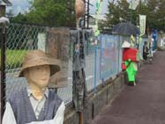 市役所入り口にかかし=@水土里ネットおおまち 用水の大切さPR 大町市役所入り口付近にユニークなかかしが並び、市民の関心を集めている。大町市土地改良区を母体とする水土里ネットおおまち地域用水対策協議会が実施したかかしコンテストに出品のあった9体。 同協議会の協力を得て米づくりに挑戦する大町西小学校の活動をまとめたパネル展示とともに、農業など地域にとって欠かすことのできない用水の大切さを呼びかけている。 ペットボトルや空き缶で作ったかかし、狩猟の姿、人気アニメキャラクターと、バラエティーに富んだかかしが市役所入り口をにぎやかにしている。 |