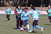 母親ピッチかける 大町でレディースサッカーフェス 県サッカー協会は10日、U−12のリーグ戦大会に合わせて、選手の母親らによる「レディースサッカーフェスティバル」を、大町市運動公園で開いた。生涯スポーツとして、競技の普及を図ろうという試みだ。 フェスには県内から4チーム約50人が出場し、順位にこだわらない8人制の交流試合を楽しんだ。選手たちは普段応援する子どもたちと立場が逆転、「お母さん、がんばれ」と大きな声援を受け、ボールを追いながらピッチを駆け抜けていた。 |