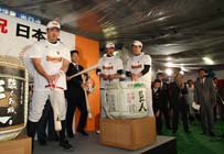| 大町地酒で巨人優勝祝う 市野屋商店 樽酒「不滅の巨人」 3年ぶりの日本一に輝いたプロ野球・読売ジャイアンツ(巨人)の勝利の美酒は、大町の地酒「不滅の巨人」。同球団のセ・リーグ優勝、日本シリーズ優勝の祝勝会ビールかけと、優勝祝賀会の樽(たる)酒は、市内の醸造元・市野屋商店(福島敏雄社長)から四斗樽が送られ、バットでの鏡開きが行われている。 |