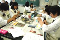 ボランティアに実技講習 松川中生ちひろ美術館で 松川村の松川中学校(小幡泰俊校長)で安曇野ちひろ美術館ボランティアの実技講習会が3、4の両日行われた。同ボランティアは、希望する生徒が夏休み期間中、同美術館で水彩技法「にじみ絵」体験のアシスタントを務める。160人の生徒が参加した。 同館職員がにじみ技法のやり方を実演しながら説明。生徒らは、ぬらした紙に絵の具をにじませて思い思いの模様を描き、カードを作った。ほとんどがボランティア経験者という2、3年生は、体験を通して再確認していた。絵本作家の展覧会に合わせたワークショップのボランティア講習も行った。紙を工作して、絵本を題材にした作品づくりを体験した。 |