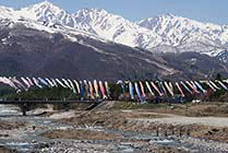 色とりどりのこいのぼりは、雄大な白馬三山と美しい平川のせせらぎを背に、川面を渡る風に吹かれて、気持ちよさそうに泳いでいる。国道を走る車や地域住民が川幅いっぱいのこいのぼりに「壮観ですね」と感動の声をあげていた。 |