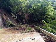 美麻地区から信州新町に通じる県道川口大町線では10日午後7時ころ、土砂崩落や倒木により全面通行止めとなった。信州新町境までの約900bの間、複数か所で土砂の崩落や流出、路肩決壊などが確認できた。最も被害が大きい現場は美麻側の信州新町境で、高さ6b、幅12bの落石防止柵が土砂や倒木に押し倒される形で道をふさいだ。大町建設事務所などは翌11日朝から現地調査を行い復旧方法など検討した。「1週間程度で応急復旧を済ませ片側通行含め交通を確保したい」としている。 |