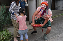 小谷村千国の千国諏訪神社で12、13の両日、例祭が開かれた。同祭りは別名「ささら祭り」と呼ばれる奇祭として有名。13日に行われた本祭りでは、村の若者有志が、竹の先を細かく割ったささらと男根を模った棒を持ち、ひょっとこのお面をかぶったユニークいでたちに身を包んで登場。ささらをすり合わせながら若い女性や子どもを追いかけ、祭り行列とともに集落内を練り歩いた。 |