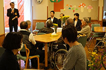 会では利用者の日ごろの施設での生活ぶりや、懐かしい写真をスライドショーで披露。利用者の家族や施設職員の心のこもったメッセージが添えられ、感動を呼んだ。地元飯田地区の飯田神明社の勇壮な祭りみこしも施設の前を練り歩き、利用者の長寿を祝った。 |
