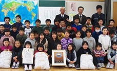 松川村の安曇野まつかわ農業小学校(村農業委員会・村営農支援センター主宰)はこのほど、松川小学校の3年生82人が栽培したコシヒカリ180`を国際支援米として、アフリカのマリ共和国へ発送するための発送式と米・食味分析鑑定コンクール国際大会小学校部門金賞受賞の伝達式を行った。 |
